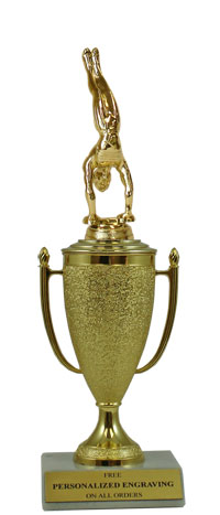 Recognize a special achievement with our classic cup trophy. Features a gold cup and gymnastics figure with a high-quality slant-front marble base. Includes up to 3 lines of black text personalized engraving on a gold flexi-plate. Quantity discounts available. Use our Personalization Wizard to easily enter your personalized engraving. Outstanding for honoring gymnastics excellence and achievement. Ships from: Marquette, Michigan. SKU: cup-gym-p-tc.