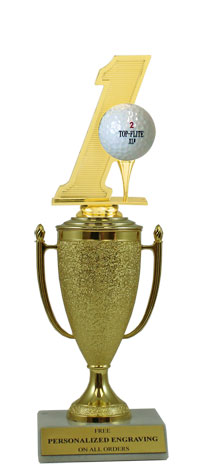 Recognize a special achievement with our classic cup trophy. Features a gold cup and hole-in-one figure with a high-quality slant-front marble base. Includes up to 3 lines of black text personalized engraving on a gold flexi-plate. Quantity discounts available. Use our Personalization Wizard to easily enter your personalized engraving. Ships from: Marquette, Michigan. SKU: cup-hole-p-tc.