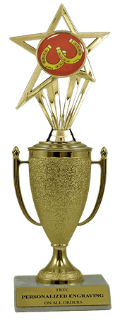 Recognize a special achievement with our fabulous cup & insert trophy. Features a gold cup and horseshoes insert with a high-quality slant-front marble base. Includes up to 3 lines of black text personalized engraving on a gold flexi-plate. Quantity discounts available. Use our Personalization Wizard to easily enter your personalized engraving. Use to create awards recognizing horsemanship and competitive riding excellence. Also great for events involving the game of horseshoes! Ships from: Marquette, Michigan. SKU: cup-horseshoes-in-tc.