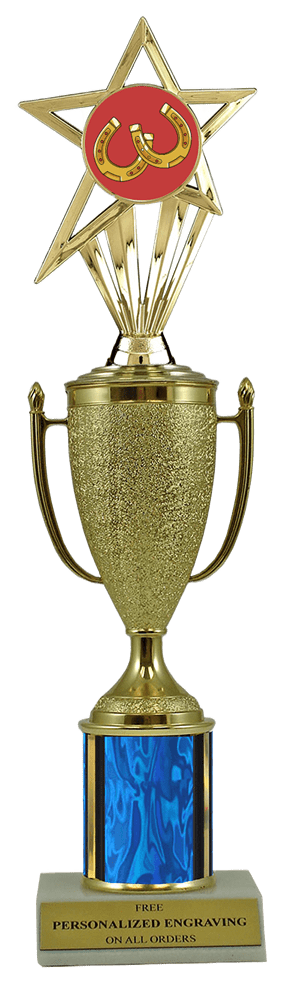 This unique award features a real marble slant-front base, choice of column color and a gold cup with a fabulous horseshoes insert. It also includes up to 3 lines of personalized engraving for free. This trophy is a great choice when you want to recognize a special horseshoes achievement but don't want to spend a fortune. Select size and color below. Magnificent for celebrating excellence and victory. Ships from: Marquette, Michigan. SKU: cup-horseshoes-scb-i-mqt.