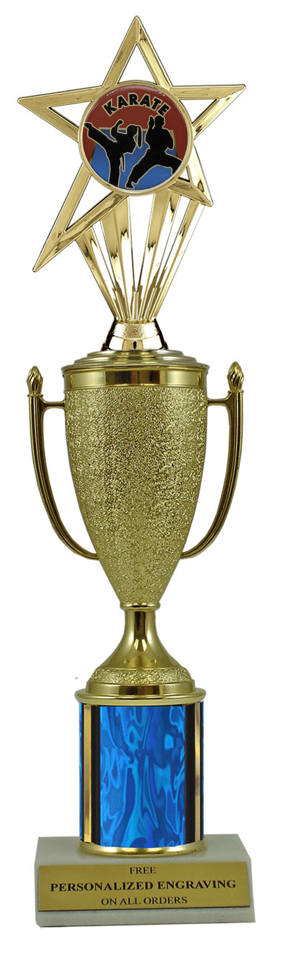 This unique award features a real marble slant-front base, choice of column color and a gold cup with a fabulous karate insert. It also includes up to 3 lines of personalized engraving for free. This trophy is a great choice when you want to recognize a special karate achievement but don't want to spend a fortune. Select size and color below. A great choice for acknowledging excellence and victory. Ships from: Marquette, Michigan. SKU: cup-karate-scb-i-mqt.