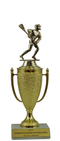 Recognize a special achievement with our classic cup trophy. Features a gold cup and lacrosse figure with a high-quality slant-front marble base. Includes up to 3 lines of black text personalized engraving on a gold flexi-plate. Quantity discounts available. Use our Personalization Wizard to easily enter your personalized engraving. Magnificent for recognizing excellence and victory. Ships from: Marquette, Michigan. SKU: cup-lacrosse-p-qtt.