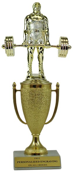 Recognize a special achievement with our classic cup trophy. Features a gold cup and weightlifting figure with a high-quality slant-front marble base. Includes up to 3 lines of black text personalized engraving on a gold flexi-plate. Quantity discounts available. Use our Personalization Wizard to easily enter your personalized engraving. A wonderful choice for rewarding excellence and victory. Ships from: Marquette, Michigan. SKU: cup-lift-p-tc.