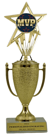 Recognize a special achievement with our fabulous cup & insert trophy. Features a gold cup and MVP insert with a high-quality slant-front marble base. Includes up to 3 lines of black text personalized engraving on a gold flexi-plate. Quantity discounts available. Use our Personalization Wizard to easily enter your personalized engraving. A great choice for acknowledging excellence and victory. Ships from: Marquette, Michigan. SKU: cup-mvp-in-tc.