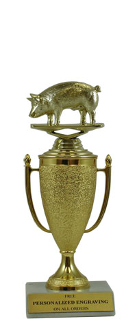 Recognize a special achievement with our classic cup trophy. Features a gold cup and pig figure with a high-quality slant-front marble base. Includes up to 3 lines of black text personalized engraving on a gold flexi-plate. Quantity discounts available. Use our Personalization Wizard to easily enter your personalized engraving. A wonderful choice for rewarding excellence and victory. Ships from: Marquette, Michigan. SKU: cup-pig-p-qtt.