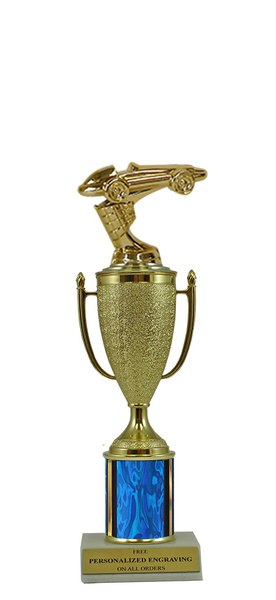 This unique design combines a gold cup with a pinewood derby figure. Award features a real marble slant-front base and choice of column color. It also includes up to 3 lines of personalized engraving for free. This trophy is a great choice when you want to recognize a special achievement but don't want to spend a fortune. Select size and color below. Ships from: Marquette, Michigan. SKU: cup-pine-scb-tc.