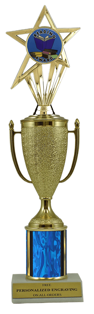 This unique award features a real marble slant-front base, choice of column color and a gold cup with a fabulous reading insert. It also includes up to 3 lines of personalized engraving for free. This trophy is a great choice when you want to recognize a special reading achievement but don't want to spend a fortune. Select size and color below. A great choice for acknowledging excellence and victory. Ships from: Marquette, Michigan. SKU: cup-reading-scb-i-mqt.