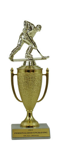 Recognize a special achievement with our classic cup trophy. Features a gold cup and roller hockey figure with a high-quality slant-front marble base. Includes up to 3 lines of black text personalized engraving on a gold flexi-plate. Quantity discounts available. Use our Personalization Wizard to easily enter your personalized engraving. A wonderful choice for rewarding excellence and victory. Ships from: Marquette, Michigan. SKU: cup-roller-p-qtt.
