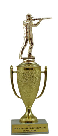 Recognize a special achievement with our classic cup trophy. Features a gold cup and trap skeet shooting figure with a high-quality slant-front marble base. Includes up to 3 lines of black text personalized engraving on a gold flexi-plate. Quantity discounts available. Use our Personalization Wizard to easily enter your personalized engraving. A wonderful choice for rewarding excellence and victory. Ships from: Marquette, Michigan. SKU: cup-shoot-p-tc.
