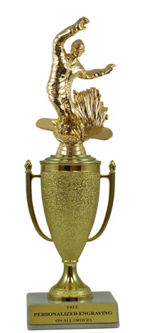 Recognize a special achievement with our classic cup trophy. Features a gold cup and skateboarding figure with a high-quality slant-front marble base. Includes up to 3 lines of black text personalized engraving on a gold flexi-plate. Quantity discounts available. Use our Personalization Wizard to easily enter your personalized engraving. Magnificent for recognizing excellence and victory. Ships from: Marquette, Michigan. SKU: cup-skateboard-p-qtt.