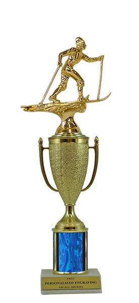 This unique design combines a gold cup with a cross country skiing figure. Award features a real marble slant-front base and choice of column color. It also includes up to 3 lines of personalized engraving for free. This trophy is a great choice when you want to recognize a special achievement but don't want to spend a fortune. Select size and color below. A great choice for acknowledging excellence and victory. Ships from: Marquette, Michigan. SKU: cup-skicc-scb-qtt.