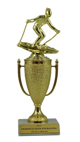 Recognize a special achievement with our classic cup trophy. Features a gold cup and downhill skiing figure with a high-quality slant-front marble base. Includes up to 3 lines of black text personalized engraving on a gold flexi-plate. Quantity discounts available. Use our Personalization Wizard to easily enter your personalized engraving. A wonderful choice for rewarding excellence and victory. Ships from: Marquette, Michigan. SKU: cup-skidown-p-tc.