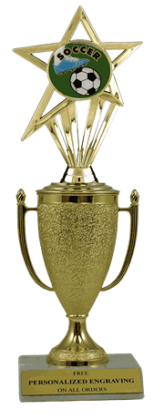 Recognize a special achievement with our fabulous cup & insert trophy. Features a gold cup and soccer insert with a high-quality slant-front marble base. Includes up to 3 lines of black text personalized engraving on a gold flexi-plate. Quantity discounts available. Use our Personalization Wizard to easily enter your personalized engraving. Great for soccer season awards and tournament victories. Ships from: Marquette, Michigan. SKU: cup-soccer-in-tc.
