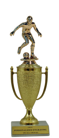 Recognize a special achievement with our classic cup trophy. Features a gold cup and soccer figure with a high-quality slant-front marble base. Includes up to 3 lines of black text personalized engraving on a gold flexi-plate. Quantity discounts available. Use our Personalization Wizard to easily enter your personalized engraving. Looking for something different? See all of our soccer trophies. Great for soccer season awards and tournament victories. Ships from: Marquette, Michigan. SKU: cup-soccer-p-tc.