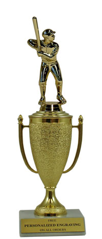 Recognize a special achievement with our classic cup trophy. Features a gold cup and softball figure with a high-quality slant-front marble base. Includes up to 3 lines of black text personalized engraving on a gold flexi-plate. Quantity discounts available. Use our Personalization Wizard to easily enter your personalized engraving. A wonderful choice for rewarding excellence and victory. Ships from: Marquette, Michigan. SKU: cup-soft-p-tc.