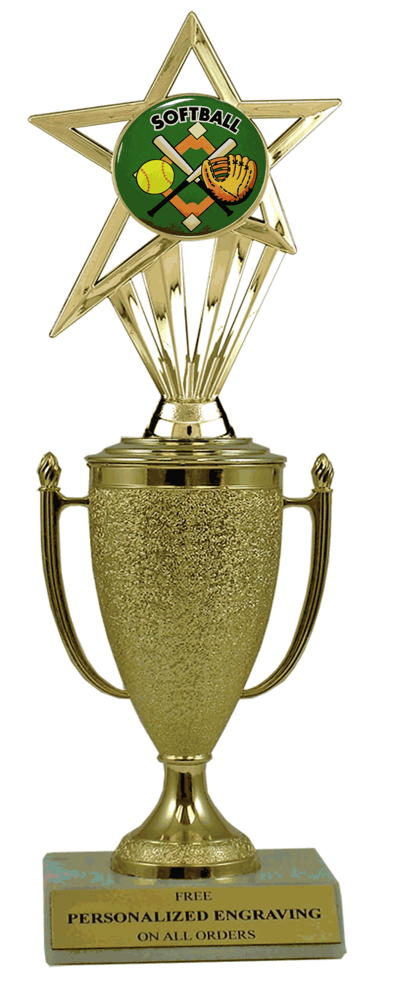 Recognize a special achievement with our fabulous cup & insert trophy. Features a gold cup and softball insert with a high-quality slant-front marble base. Includes up to 3 lines of black text personalized engraving on a gold flexi-plate. Quantity discounts available. Use our Personalization Wizard to easily enter your personalized engraving. A great choice for acknowledging excellence and victory. Ships from: Marquette, Michigan. SKU: cup-softball-in-tc.