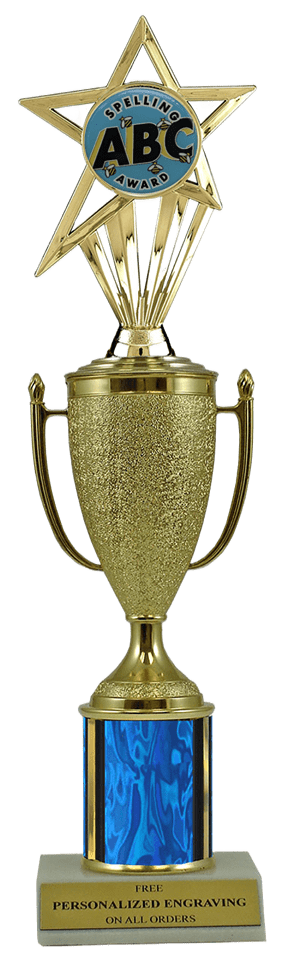 This unique award features a real marble slant-front base, choice of column color and a gold cup with a fabulous spelling insert. It also includes up to 3 lines of personalized engraving for free. This trophy is a great choice when you want to recognize a special spelling achievement but don't want to spend a fortune. Select size and color below. Magnificent for honoring excellence and victory. Ships from: Marquette, Michigan. SKU: cup-spelling-scb-i-mqt.