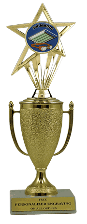 Recognize a special achievement with our fabulous cup & insert trophy. Features a gold cup and swimming insert with a high-quality slant-front marble base. Includes up to 3 lines of black text personalized engraving on a gold flexi-plate. Quantity discounts available. Use our Personalization Wizard to easily enter your personalized engraving. Perfect for swimming season competitions and meet awards. Ships from: Marquette, Michigan. SKU: cup-swimming-in-tc.