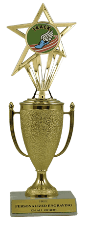 Recognize a special achievement with our fabulous cup & insert trophy. Features a gold cup and track insert with a high-quality slant-front marble base. Includes up to 3 lines of black text personalized engraving on a gold flexi-plate. Quantity discounts available. Use our Personalization Wizard to easily enter your personalized engraving. Outstanding for acknowledging track excellence and achievement. Ships from: Marquette, Michigan. SKU: cup-track-in-tc.