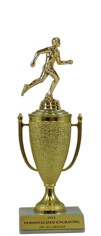 Recognize a special achievement with our classic cup trophy. Features a gold cup and track & field figure with a high-quality slant-front marble base. Includes up to 3 lines of black text personalized engraving on a gold flexi-plate. Quantity discounts available. Use our Personalization Wizard to easily enter your personalized engraving. Outstanding for honoring track excellence and achievement. Ships from: Marquette, Michigan. SKU: cup-track-p-tc.