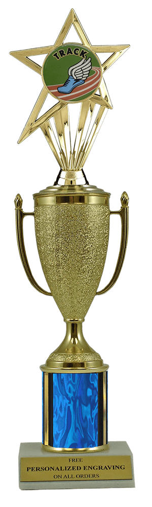 This unique award features a real marble slant-front base, choice of column color and a gold cup with a fabulous track & field insert. It also includes up to 3 lines of personalized engraving for free. This trophy is a great choice when you want to recognize a special track achievement but don't want to spend a fortune. Select size and color below. Outstanding for acknowledging track excellence and achievement. Ships from: Marquette, Michigan. SKU: cup-track-scb-i-mqt.