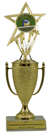 Recognize a special achievement with our fabulous cup & insert trophy. Features a gold cup and volleyball insert with a high-quality slant-front marble base. Includes up to 3 lines of black text personalized engraving on a gold flexi-plate. Quantity discounts available. Use our Personalization Wizard to easily enter your personalized engraving. Ships from: Marquette, Michigan. SKU: cup-volleyball-in-tc.