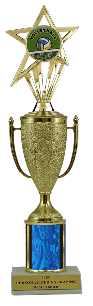 This unique award features a real marble slant-front base, choice of column color and a gold cup with a fabulous vollyball insert. It also includes up to 3 lines of personalized engraving for free. This trophy is a great choice when you want to recognize a special vollyball achievement but don't want to spend a fortune. Select size and color below. A great choice for acknowledging excellence and victory. Ships from: Marquette, Michigan. SKU: cup-vollyball-scb-i-mqt.