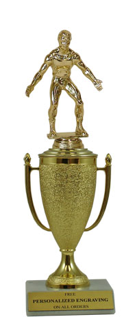Recognize a special achievement with our classic cup trophy. Features a gold cup and wrestling figure with a high-quality slant-front marble base. Includes up to 3 lines of black text personalized engraving on a gold flexi-plate. Quantity discounts available. Use our Personalization Wizard to easily enter your personalized engraving. Outstanding for celebrating wrestling excellence and achievement. Ships from: Marquette, Michigan. SKU: cup-wrest-p-qtt.