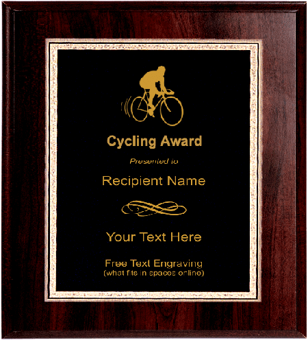 This cycling award plaque features a stock cycling logo, your text personalized engraving and a beautiful Cherry wood finish. After pressing the personalization button below, select 'Use popular template' and then enter your own text. You can also change the design to something unique! Cycling plaques are available in three popular sizes, 9"x7", 10"x8" and 12"x9". Please select below. Stock artwork and text personalized engraving is free! Shown with a black personalized engraving plate with gilded edge. Outstanding for recognizing cycling skills and dedication. Ships from: Marquette, Michigan. SKU: cycling-plaque-tc.