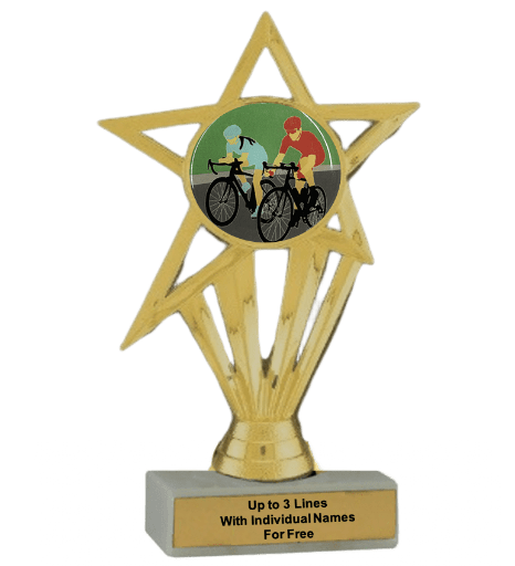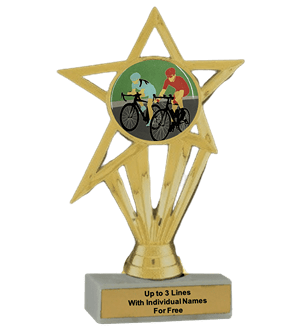 Our economy insert trophy features a real white marble base with a gold insert holder and 2" Cycling insert. Measures approximately 6 7/8" - 7 1/8" tall. Add up to three lines of text personalized engraving for free, including individual names! Outstanding for recognizing cycling skills and dedication. Ships from: Marquette, Michigan. SKU: cycling-e-part-i-tc.