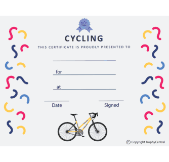 This Cycling template was designed exclusively for Trophy Central. It is a perfect and fun way to recognize race winners. Best of all, it's free! Our award certificates & templates were designed to be printable and use less ink to save you money. Simply press the View Now Button and then right click on the image and select Save File to download it. Templates measure 8 1/2" x 11". Outstanding for honoring cycling skills and dedication. SKU: cycling-tc.