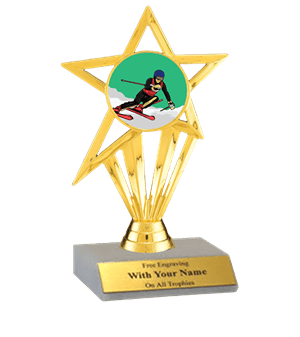 This insert participation trophy features a slant-front white marble base with a gold insert holder and 2" Downhill Skiing insert. Measures approximately 5 1/2" - 6" tall. Ships from: Marquette, Michigan. SKU: d-skiing-part-i-tc.