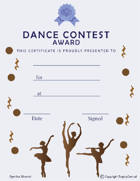This is a free Dance Contest Award (female) certificate template! Young dancers and adults alike will love being recognized for their accomplishments! Our free certificates were designed to be printable and use less ink to save you money. Simply press the View Now Button and then right click on the image and select Save File to download it. Award certificates measure 8 1/2" x 11". Outstanding for acknowledging achievement and success. SKU: dance-contest-tc.