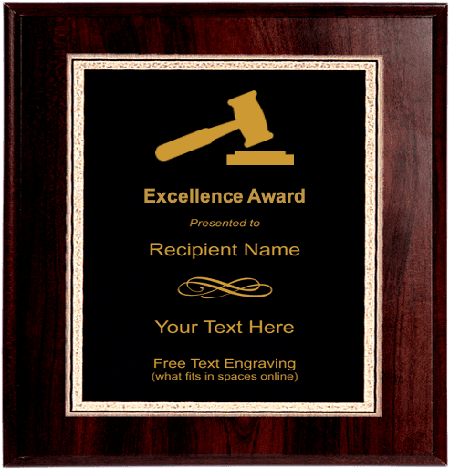 This debate award plaque features a stock gavel image, your text personalized engraving and a beautiful Cherry wood finish. Use our personalization wizard and select 'Use popular template' or create your own unique design! Debate plaques are available in three popular sizes, 9"x7", 10"x8" and 12"x9". Please select below. Stock artwork and text personalized engraving is free! Shown with a black personalized engraving plate with gilded edge. Outstanding for rewarding debate excellence and achievement. Ships from: Marquette, Michigan. SKU: debate-plaque-tc.