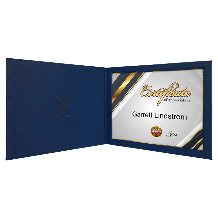 Beautiful leatherette diploma and certificate holder with soft feel. Price includes black text. Optional logo available (shown in image). Measures 12" x 9" and holds 11" x 8 1/2" certificate. Horizontal orientation (hinges on short side). Inside has acrylic sleeve to insert the certificate. SKU-dip01. Outstanding for celebrating achievement and success. Ships from: Marquette, Michigan. SKU: diploma.