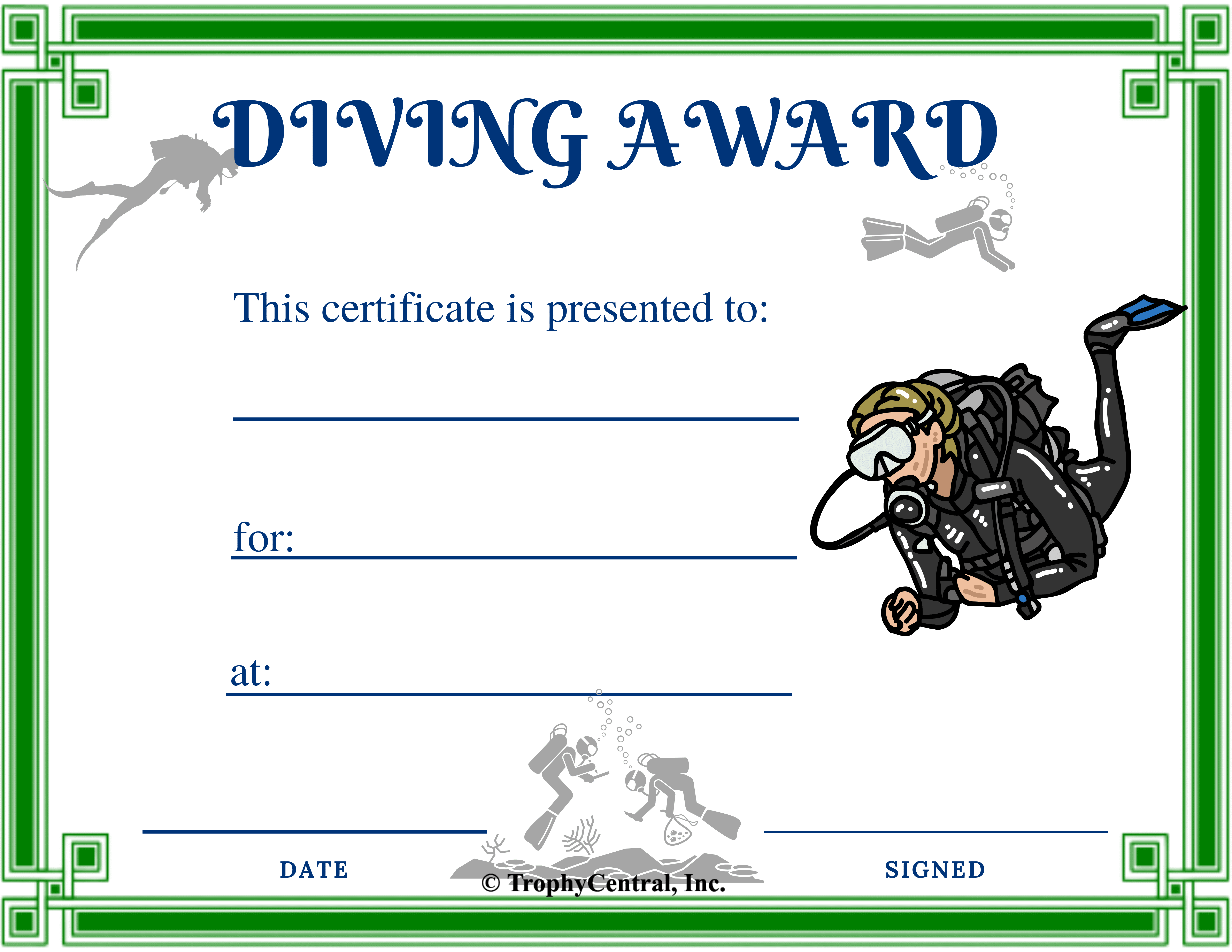 This free Diving Award template is a perfect way to recognize and reward the accomplishments of scuba divers of all ages! Our free certificates were designed to be printable and use less ink to save you money. Simply press the View Now Button and then right click on the image and select Save File to download it. Award certificates measure 8 1/2" x 11". Outstanding for acknowledging achievement and success. SKU: diving-free-tc.