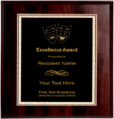 This drama award plaque features a stock drama mask logo, your text personalized engraving and a beautiful Cherry wood finish. Use our personalization wizard and select 'Use popular template' or create your own unique design! You can also change the image to another one if you prefer. Drama plaques are available in three popular sizes, 9"x7", 10"x8" and 12"x9". Please select below. Stock artwork and text personalized engraving is free! Shown with a black personalized engraving plate with gilded edge. Ships from: Marquette, Michigan. SKU: drama-plaque-tc.