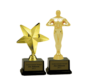The perfect theater awards to recognize your own drama star. The Star Achievement is approximately 8.25 inches in total height. The male Oscar-like Trophy measures approximately 10.5" in total height. Both items are on a 1" high plastic weighted base with a gold flexi-brass plate that engraves in black. Prices include up to 4 lines of text personalized engraving and 24 characters / spaces per line formatted online. A logo is optional (note: if you choose to have a logo, please keep in mind that depending on the size of your logo, you may not have much room for text personalized engraving). Ships from: Marquette, Michigan. SKU: dramatrophies-tc.
