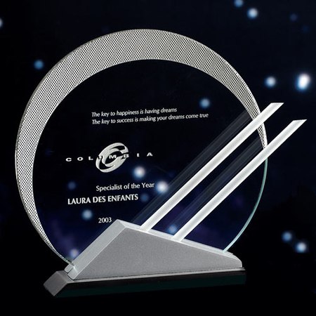 Jade crystal and lacquered wood combine forces to create a Theme-Award designed expressly for one whose talents and drive have eclipsed the competition. This play on passing circles and shadow is an artistic representation of heavenly eclipses. The aluminum rods complete the theme as they point to a future that sparkles eternally. For aesthetics we recommend etching your award inscription and positioning your logo as shown. A romance card elaborating on this theme is included for your presentation. Available in 2 Sizes. Small Measure: 6.75"H x 7"W Large Measures: 8.75"H x 8"W. Ships from: Erlanger, Kentucky. SKU: 636-jc.