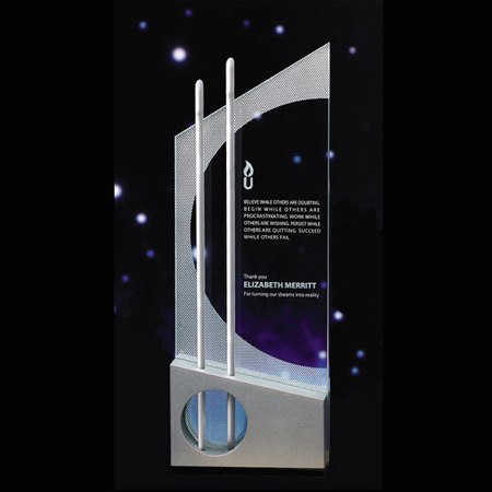 Recognize great efforts with an award that is equally outstanding. The Endeavor Theme-Award is a unique mix of media whose vertical aluminum rods reach for the stars. Crafted of jade crystal and wood that is lacquered with black and silver metal-flake, this design is a celebration of recent endeavors as well as an optimistic nod towards the future. For aesthetics we recommend etching your award inscription and positioning your logo as shown. A romance card elaborating on this theme is included for your presentation. Available in 2 Sizes. Small Measures: 11.5"H x 4.5"W Large Measures: 13"H x 4.5"W Ships from: Erlanger, Kentucky. SKU: 640-jc.