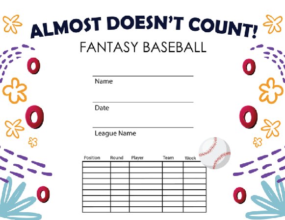 If you have someone in your league who didn't do very well, then this is just for them. This Fantasy Baseball Almost Doesn't Count Certificate is absolutely free! Our award templates were designed to be printable and use less ink to save you money. Simply press the View Now Button and then right click on the image and select Save File to download it. Fantasy certificates measure 8 1/2" x 11". Perfect for baseball season tournaments and championship games. SKU: fbb-almost-tc.