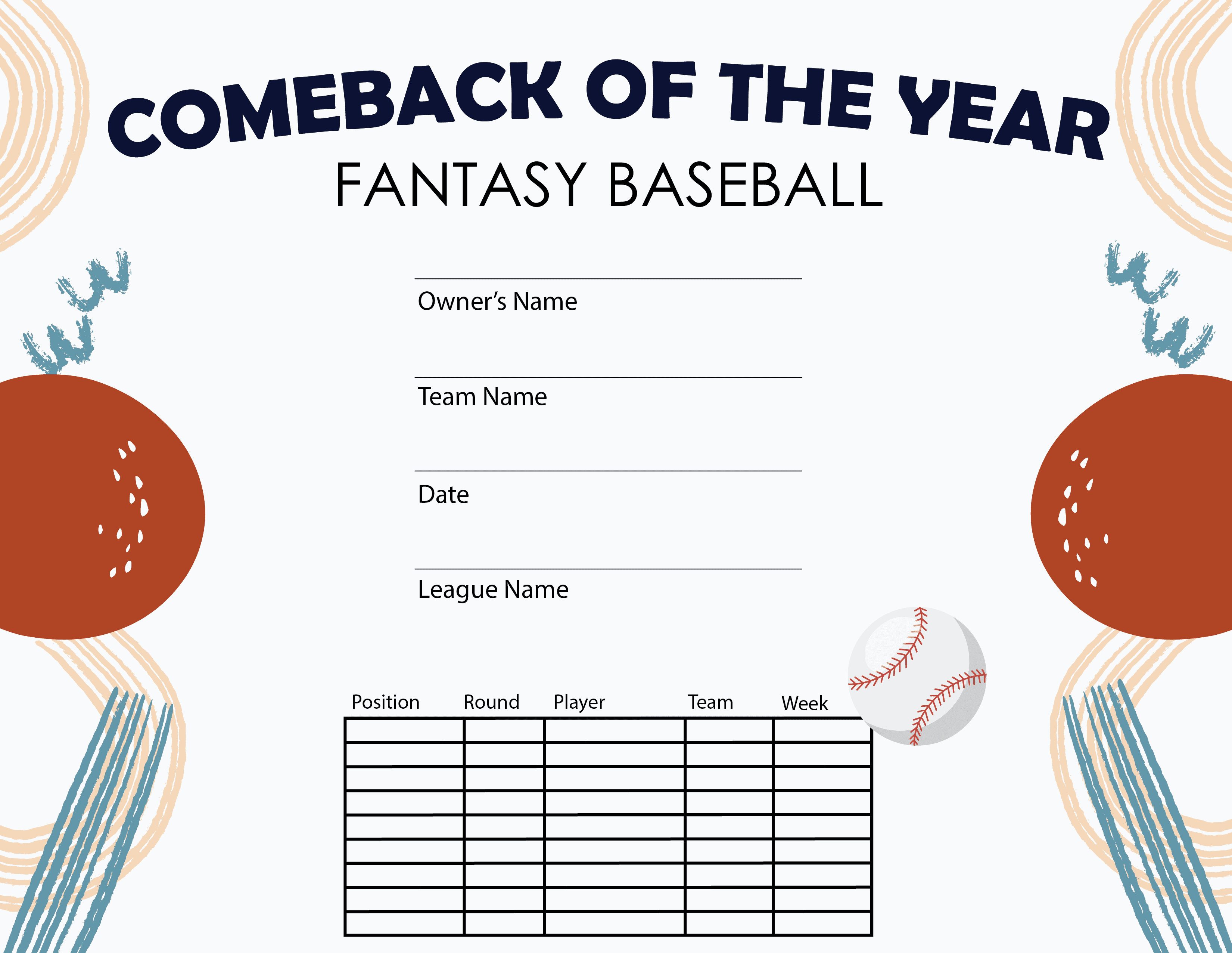 This Fantasy Baseball Comeback of the Year certificate is free! Our award templates were designed to be printable and use less ink to save you money. Simply press the View Now Button and then right click on the image and select Save File to download it. Fantasy certificates measure 8 1/2" x 11". Be sure to see all of our fantasy baseball awards and trophies! Perfect for baseball season tournaments and championship games. SKU: fbb-comeback-tc.