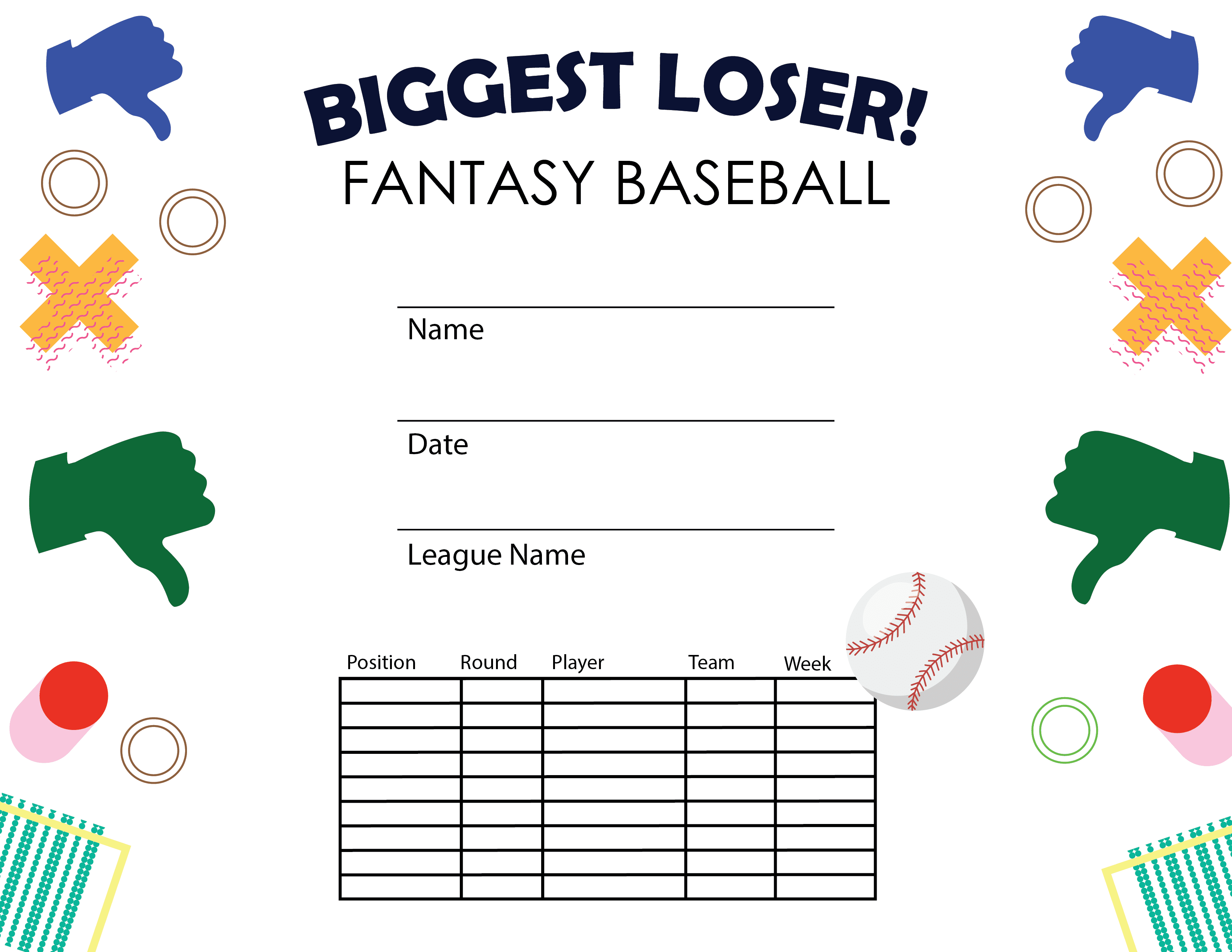 Perfect for those in your league who come in last place! This Fantasy Baseball Biggest Loser Certificate is free! Our award templates were designed to be printable and use less ink to save you money. Simply press the View Now Button and then right click on the image and select Save File to download it. Fantasy certificates measure 8 1/2" x 11". Perfect for baseball season tournaments and championship games. SKU: fbb-loser-tc.