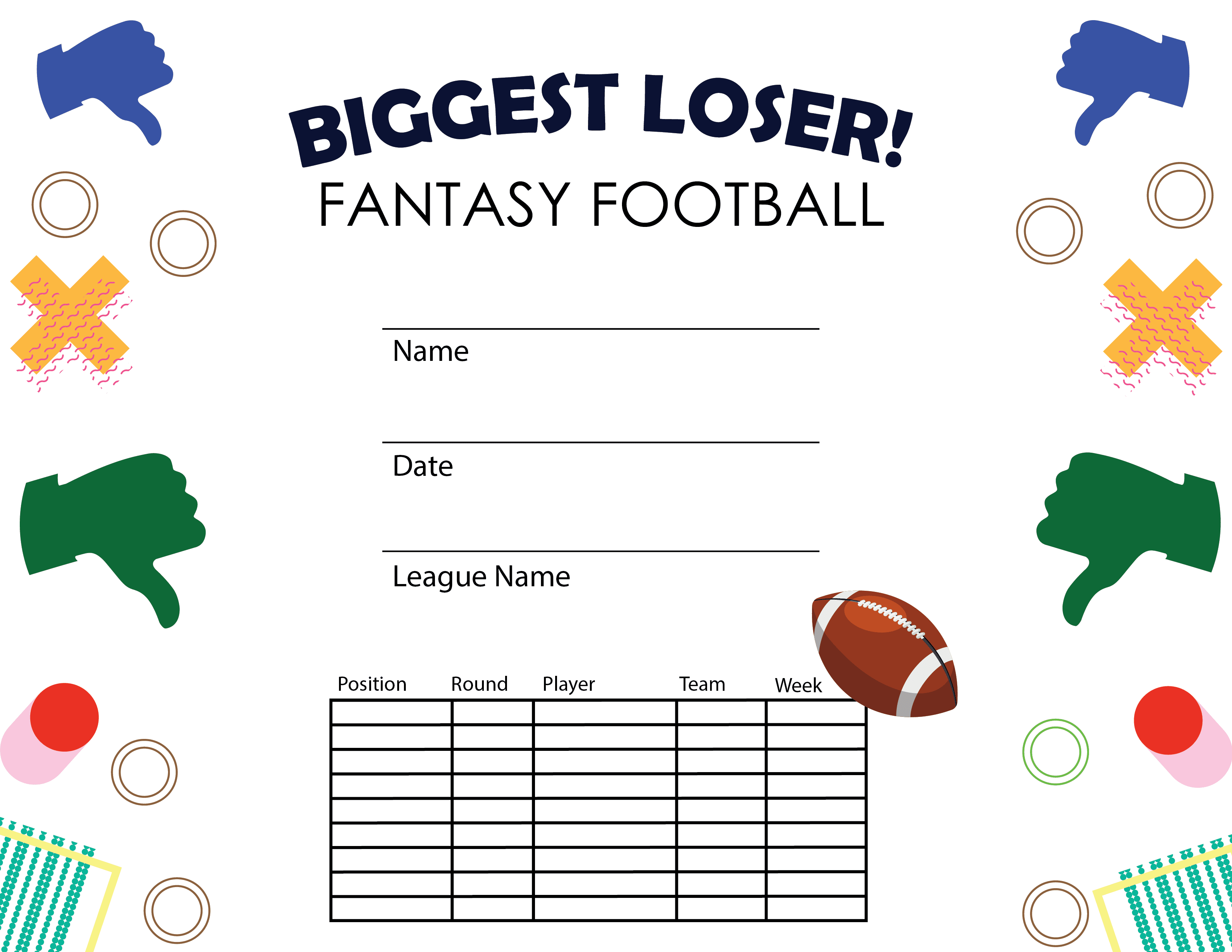 Perfect for those in your league who come in last place! This Fantasy Football Biggest Loser Certificate is free! Our award templates were designed to be printable and use less ink to save you money. Simply press the View Now Button and then right click on the image and select Save File to download it. Fantasy certificates measure 8 1/2" x 11". Be sure to see our other great fantasy football awards. Perfect for football season recognition and championship honors. SKU: ff-loser-tc.