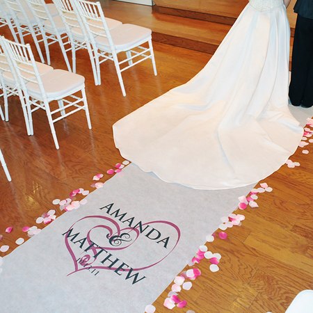 Our Embracing Hearts Aisle Runner will capture your guests attention and create a beautiful walk way for your ceremonial debut! With its interlocking heart design and romantic style ? garnished with your names, wedding date and the accent color of your choice ? this unique ceremony detail is made exclusively for every couple who chooses it. and at no additional cost! It's a gorgeous pop of personalized color for every bride and groom and ceremony must have! And because each one can be embellished in one of today's hottest wedding colors, this crisp white runner provides an ideal canvas for the trendy, DIY bride to get really creative! All Aisle Runners come complete with adhesive strip backing for placement and easy pull cord for extension. Details: Size: Measures 36 inches wide by 100 feet long. Materials: Non-woven Rayon Personalization Options: The Embracing Hearts Aisle Runner may be personalized with two block first names (max of 12 characters per name) and numeric date printed in black with your choice of cloud, aqua, sage, wisteria, petal pink, raspberry, wineberry, plum, claret, tangerine, chocolate, grey, black, burnt sienna, cinnamon, blueberry or ice blue hearts at No Additional Cost. *Please Note: Personalization is placed 8 feet down from the top of the runner. Ships from: Indianapolis, Indiana. SKU: 1015H-cc.