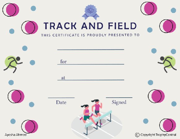 This is a free track & field certificate template (female)! Our free certificates were designed to be printable and use less ink to save you money. Simply press the View Now Button and then right click on the image and select Save File to download it. Award certificates measure 8 1/2" x 11". Outstanding for honoring track excellence and achievement. SKU: female-track-and-field-free-tc.