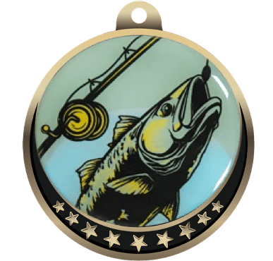 These colorful Fishing insert medals were designed exclusively for Trophy Central! Each medal features an antique gold frame with a star design and 2" Epoxy dome decal insert for a spectacular look. Medals also include a red, white and blue neck ribbon. Medal frame measures 2 3/8". Optional personalization on back. Outstanding for rewarding fishing skills and dedication. Ships from: Marquette, Michigan. SKU: fishing-mc-tc.