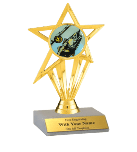 This insert participation trophy features a slant-front white marble base with a gold insert holder and 2" Fishing design insert. Measures approximately 7" tall. Outstanding for honoring fishing skills and dedication. Ships from: Marquette, Michigan. SKU: insert-participation-fishing-tc.