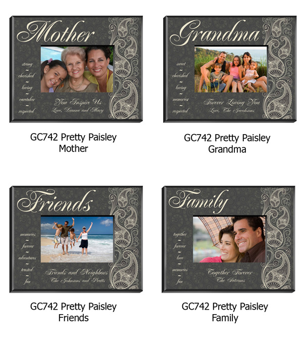 Classic with a touch of contemporary, this grey-toned picture frame with white paisley accents looks great even in the most formal location. Lovingly adorned with appropriate words of friendship written in attractive script, our personalized Pretty Paisley frame is the perfect way to honor a trusted pal or much-loved family member. Frame measures 8" x 10" and holds a 4" x 6" picture. Select appropriate header and personalize with two lines of up to 25 characters per line. Ships from: Corcoran, Minnesota. SKU: gc742-jds.