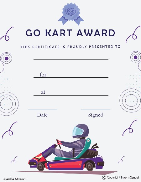 This is a free Go Kart certificate template! Our free certificates were designed to be printable and use less ink to save you money. Simply press the View Now Button and then right click on the image and select Save File to download it. Award certificates measure 8 1/2" x 11". SKU: go-kart-free-tc.